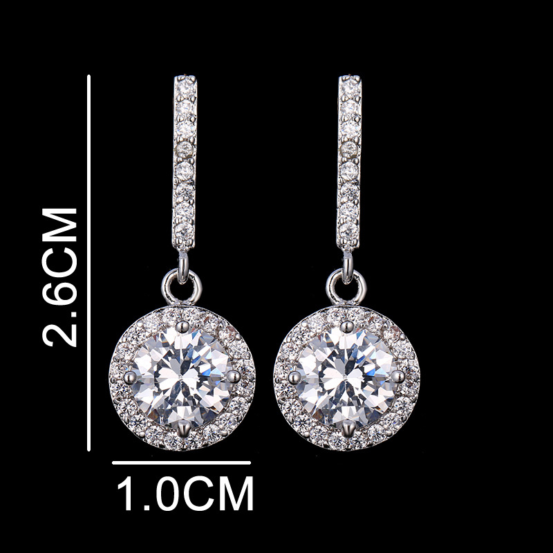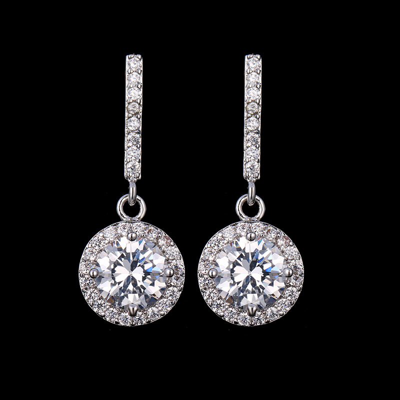 Elevate your elegance with these stunning round-cut cubic zirconia drop earrings. Each earring features a brilliant central stone surrounded by a delicate halo of sparkling pavé crystals, creating a mesmerizing display of light and brilliance. The sophisticated design includes a slender bar studded with crystals that gracefully suspends the main pendant, adding length and movement to the piece.